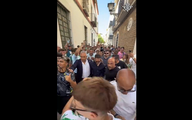 安东尼前去参加贝蒂斯为他准备的欢迎会的路上,安东尼被众多一路跟拍,左右各一保镖开路!